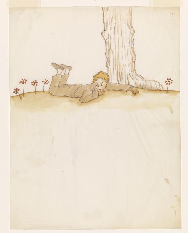A preparatory watercolor drawing by Saint-Exupéry for Le petit prince related to the illustration published with the caption "Et, couché dans l'herb, il pleura" ([Paris]: Gallimard, c1946 [1967 impression]) p. 73. See also MA 2592.27.