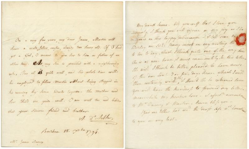 [M.d'A]: Writing of the birth of his son Alex: "In a very few years, my dear James, Martin will have a walk-fellow cousin, already two hours old. If I had got a Girl, I meant to give her to him as fellow of an other Kind. As my Son is provided with a neighbouring wife, Thus all is quite well, and his whole time will be employed to follow Martin without being stopped in his running by some adroite Coquette. the Mother and her Child are quite well"; [SB]: writing of her joy at the "happy Deliverance"; saying that Fanny is insisting that she write today to their aunt Rebecca, who is currently at James's house, though "[s]he will I think be better pleased to have news of the dear Soul 3 or four days hence, which I will then certainly write to her"; sending her "affectionate remembrances" to his wife Sarah and son Martin; mentioning that Esther has received "the draft safe wch. I mentioned to you in my last."