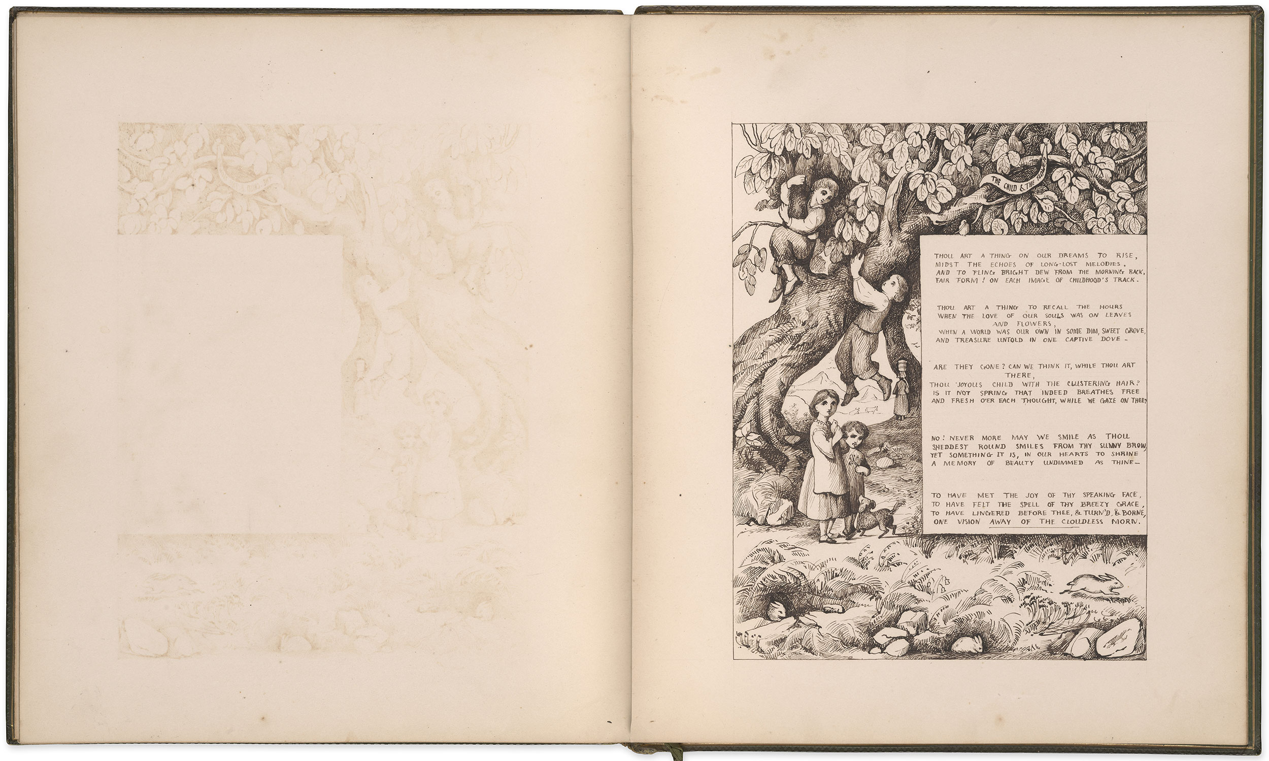 Illustrated manuscript album contains twelve poems copied out by Frederica St. John Orlebar (née Frederica St. John Rouse Boughton) of Larden Hall, Shipton, in Shropshire, and extensively illustrated by her in pen and ink; dedicated on the title page to her aunt, the botanical artist and author Frances ("Fanny") Stackhouse Acton, of Acton Scott, and dated Christmas 1858; executed on card weight album leaves, with a preliminary illustrated title page and dedication page, and an illustrated contents leaf featuring a troop of six children bearing six flags inscribed with the titles of the twelve poems which follow on 29 pages of verse within illustrated borders. The unattributed texts include verses drawn from six poems by Felicia Hemans, and two each from Sir Walter Scott and Henry Wadsworth Longfellow, along with verses from traditional ballads and popular rhymes. The subjects treated by Orlebar's drawings are largely in keeping with the chosen texts, including a view of Roslyn Chapel ablaze, a sea cave, children drowned and buried, a fox hunt, the elfin king underground, fairies riding unicorns and dancing, Dunfermline Abbey, moody shorelines, angels, and children at play.
