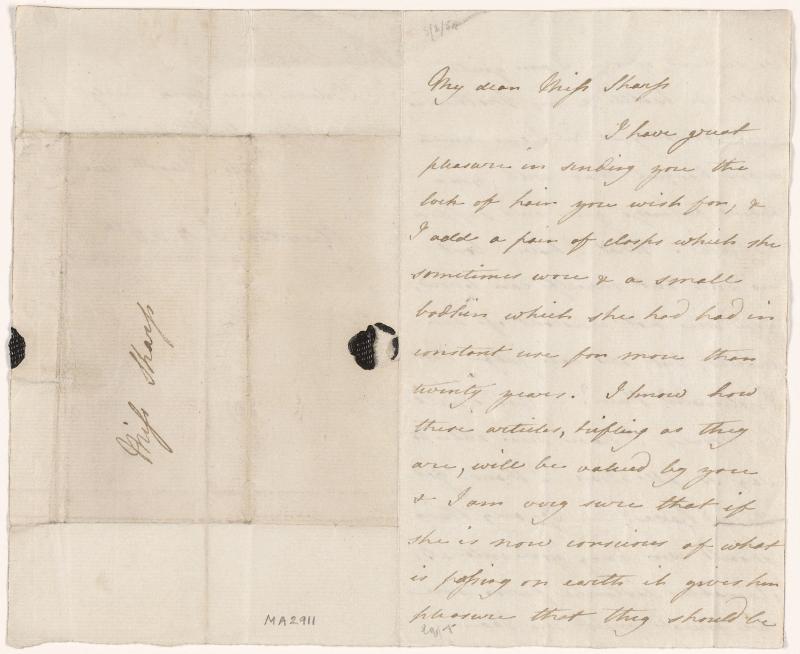 Part of a collection of 8 autograph letters from Jane Austen, 2 autograph letters from Cassandra Austen, a memorandum of accounts in Jane Austen's hand, and a memorandum in Cassandra's hand concerning the dates of composition of Jane Austen's novels. Items in the collection are described in 12 individual records (MA 2911.1-12).