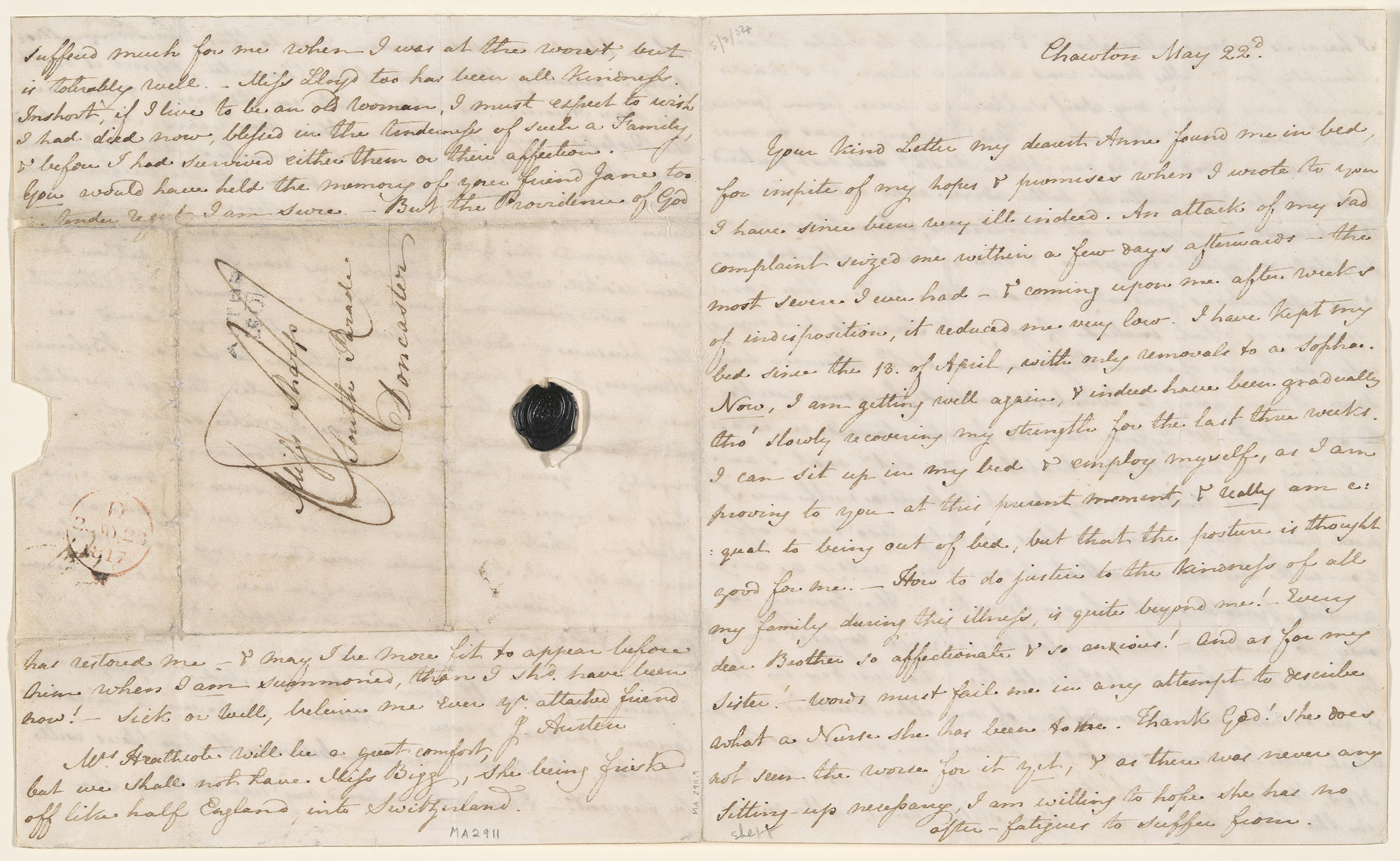 Part of a collection of 8 autograph letters from Jane Austen, 2 autograph letters from Cassandra Austen, a memorandum of accounts in Jane Austen's hand, and a memorandum in Cassandra's hand concerning the dates of composition of Jane Austen's novels. Items in the collection are described in 12 individual records (MA 2911.1-12).