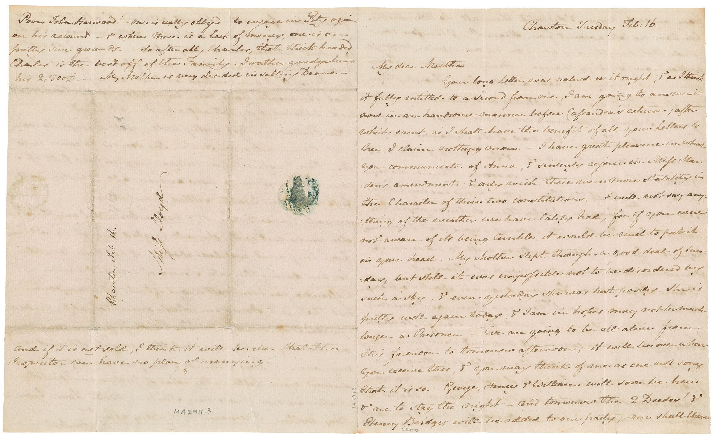 Part of a collection of 8 autograph letters from Jane Austen, 2 autograph letters from Cassandra Austen, a memorandum of accounts in Jane Austen's hand, and a memorandum in Cassandra's hand concerning the dates of composition of Jane Austen's novels. Items in the collection are described in 12 individual records (MA 2911.1-12).