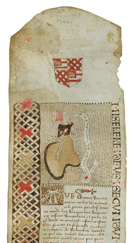 Written and decorated for the wife of William Flemyng (Fleming), who was alive in 1474 (quarterly Lancaster: argent two fesses gules, a lion passant gardant or on a canton of the last; and Fleming: argent fretty gules); purchased by J. Pierpont Morgan (1837-1913) from Pearson in 1912; J.P. Morgan (1867-1943).