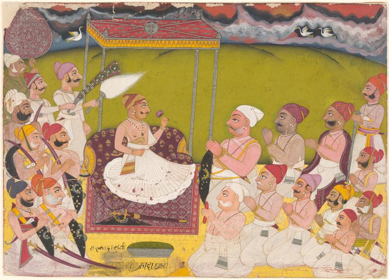 [Raja Rādhekādas holding court].