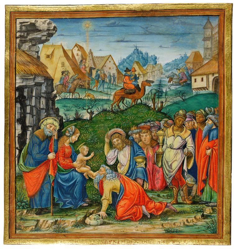 Decoration: 1 miniature with the Adoration of the Magi; background of German houses in the miniature are derived from Albrect Dürer's engraving of the Prodigal Son; the castle on the hilltop is derived from his engraving of the Sea Monster.