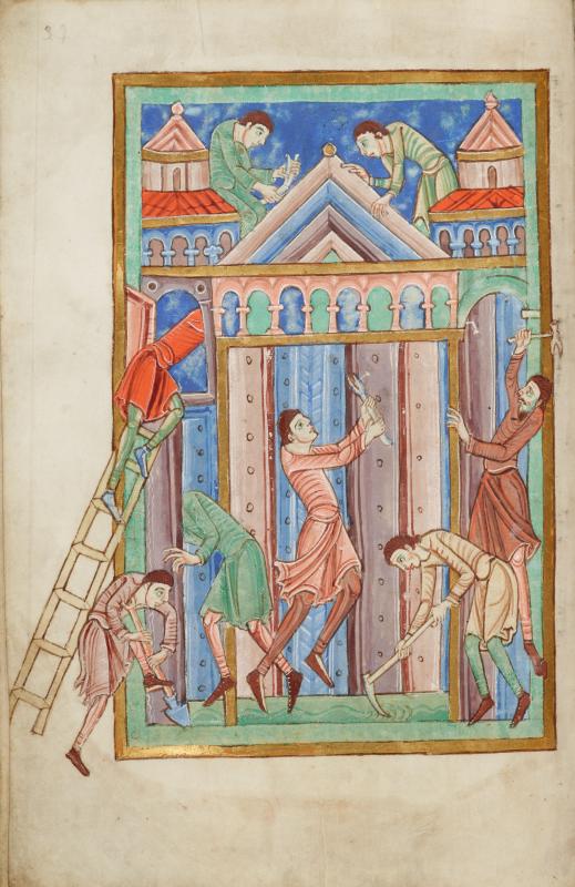One of the earliest illustrated biographies of an English saint, this lavish volume was a testimonial to patron saint and abbey alike. Most miniatures are based on the passion text of Abbo of Fleury (945-1004); the posthumous miracles depend on Osbert of Clare's text, composed for Anselm shortly before this manuscript was made. In this image, eight thieves are miraculously paralyzed when they attempt to break into Edmund's burial place. The miniatures are attributed to the Alexis Master, founder of the St. Albans school. Named after his St. Alexis cycle in the St. Albans Psalter, he skillfully combined Anglo-Saxon, Ottonian, and Byzantine influences to create England's earliest Romanesque style.