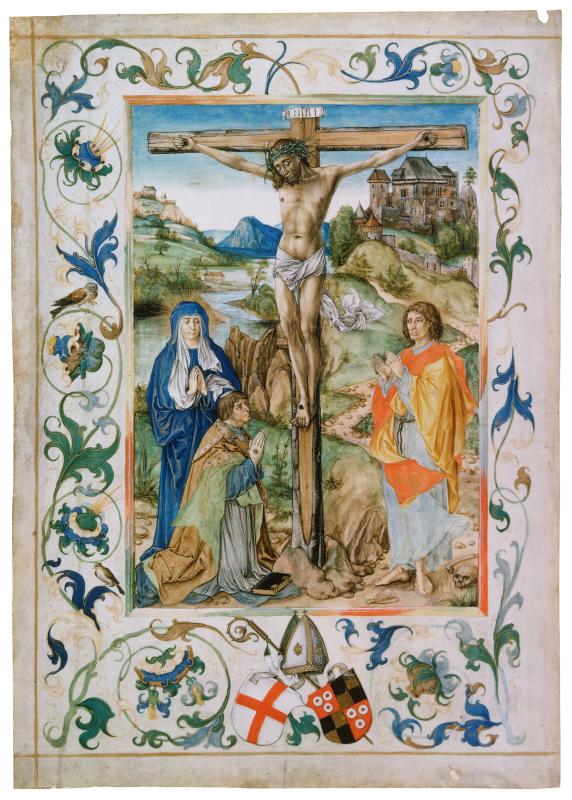 Decoration: 1 full-page miniature with floral border containing a coat-of-arms: Crucifixion in a landscape with Mary, John, and the donor, Bishop Hugo von Hohenlandenberg (1460-1532), kneeling at the foot of the cross. The miniature has been attributed to Springinklee der Ältere, the postulated father of the illuminator Hans Springinklee (see Merkl 1999, p. 361).