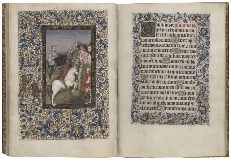 Decoration: 24 full-page miniatures, 8 small miniatures, 12 calendar illustrations, border decoration with marginal narrative scenes, executed in grisaille with additional colors.