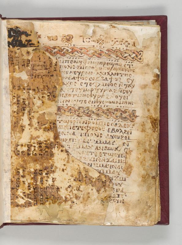 Ancient binding: According to Petersen: Upper and lower covers, with the back, of leather, over papyrus boards (Bybliothecae Pierpont Morgan codices Coptici photographice expressi, vol. 56, pls. 1, 2, 75, 76). Cf. also Cockerell 1932.500 Present manuscript is part of the so-called "Edfu" collection, now mostly at the British Library. See Layton, Catalogue of Coptic literary manuscripts in the British Library acquired since the year 1906, 1987, XXVII-XXX. (Binding catalogued separately as MS M.633A.)