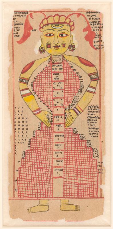 Decoration: 1 watercolor of a standing figure of a human with numerals and words, a tantric scheme superimposed on his body.