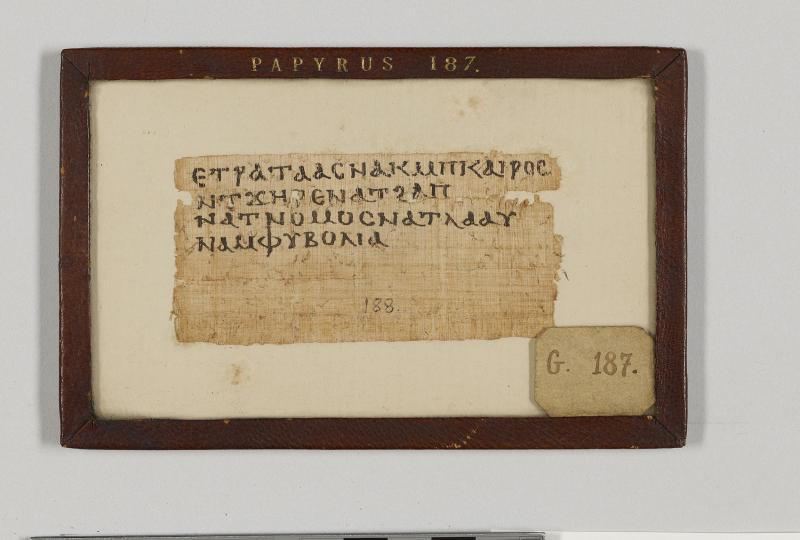 1 pane of glass containing 1 papyrus fragment ; 1 1/2 x 3 1/2 inches