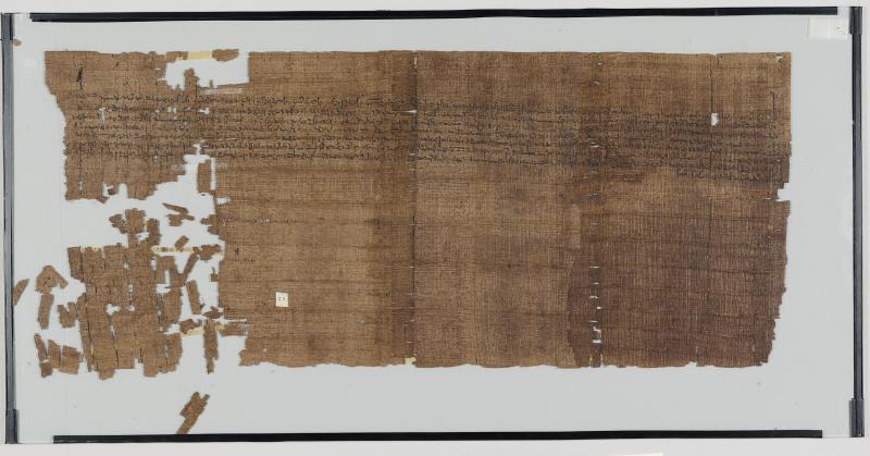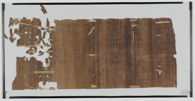 1 pane of glass containing 1 papyrus fragment ; 12 x 27 inches