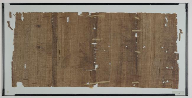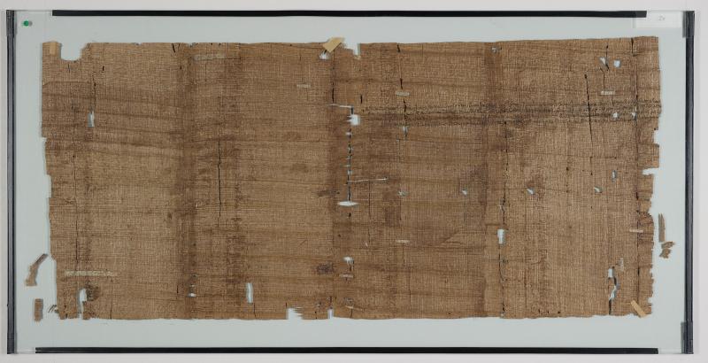 1 pane of glass containing 1 papyrus fragment ; 13 x 29 1/2 inches