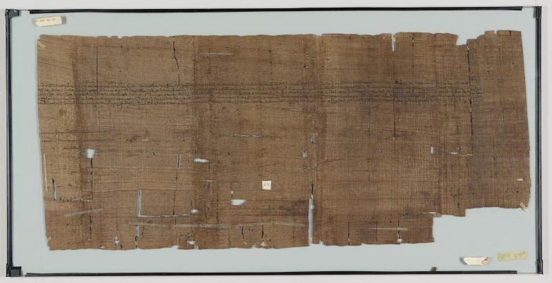 1 pane of glass containing 1 papyrus fragment ; 13 x 29 inches