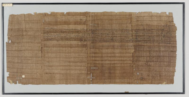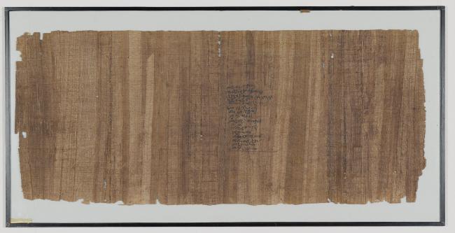1 pane of glass containing 1 papyrus fragment ; 13 x 30 inches