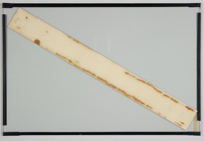 1 pane of glass containing papyrus fragments ; 19 x 2 inches