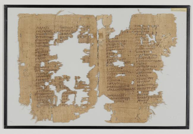 1 pane of glass containing 2 papyrus fragments ; 11 x 8 inches