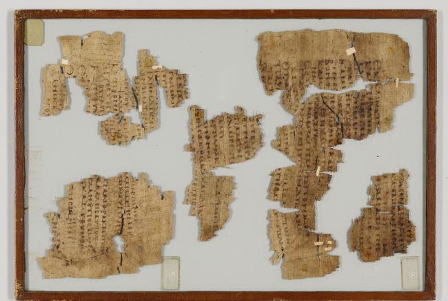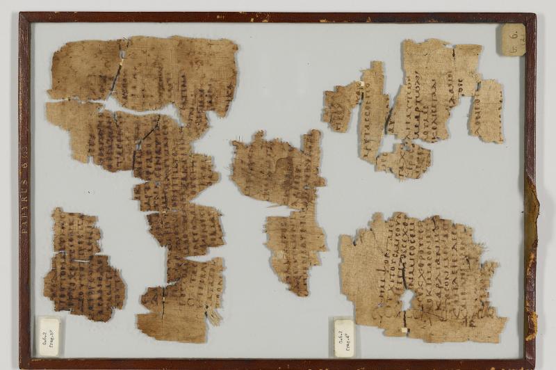1 pane of glass containing 13 papyrus fragments ; 4 x 6 inches