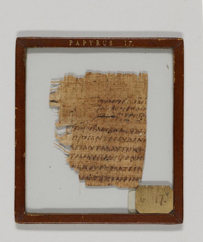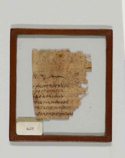 1 pane of glass containing 1 papyrus fragment ; 3.5 x 3.5 inches