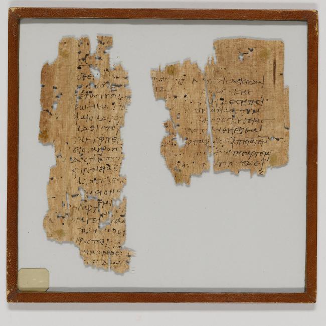 1 pane of glass containing 3 papyrus fragments ; 9 x 9 inches