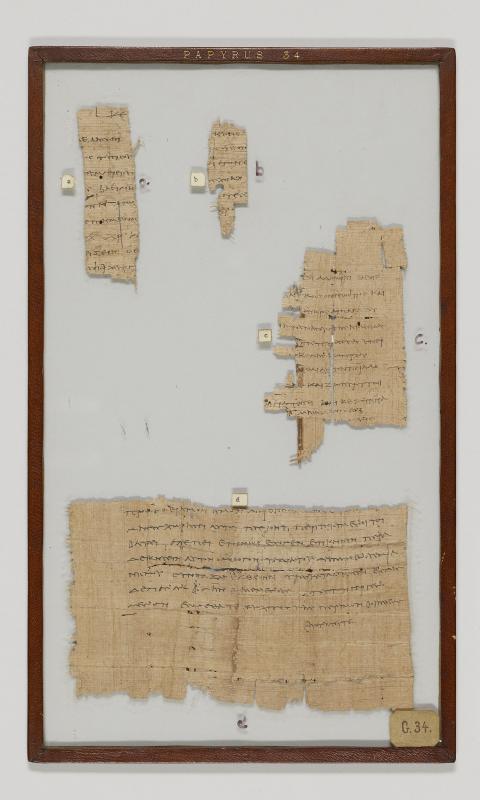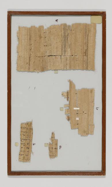 1 pane of glass containing 4 papyrus fragments ; 4 x 1.5 in.; 2 x 1 in.; 5.5 x 3.5 in.; 4.5 x 7.5 in.