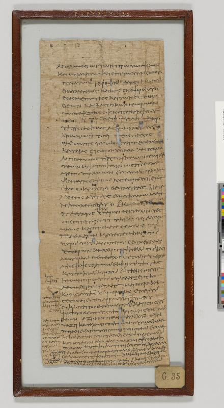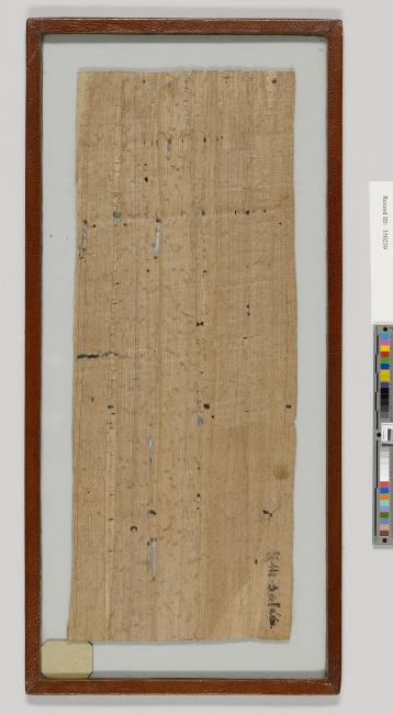 1 pane of glass containing 1 papyrus fragment ; 12 x 5 inches