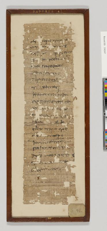 1 pane of glass containing 1 papyrus fragment ; 12 x 3.5 inches