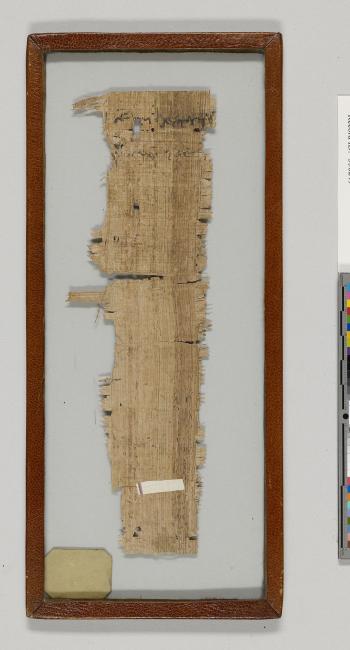 1 pane of glass containing 1 papyrus fragment ; 7.5 x 2.5 inches