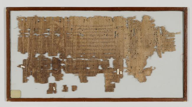 1 pane of glass containing 4 papyrus fragments ; 17 x 8 in.; .5 x.5 in.; .5 x 1 in.; 1 x 1.5 in.