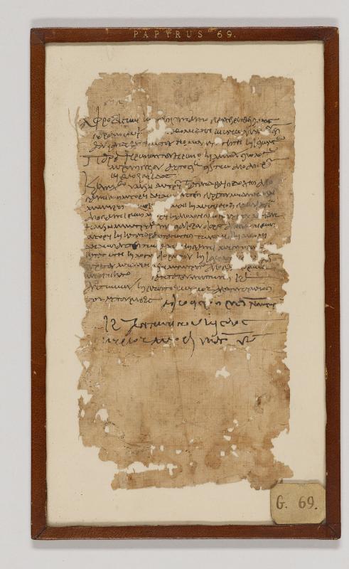 1 pane of glass containing 1 papyrus fragment ; 8.5 x 4.5 inches
