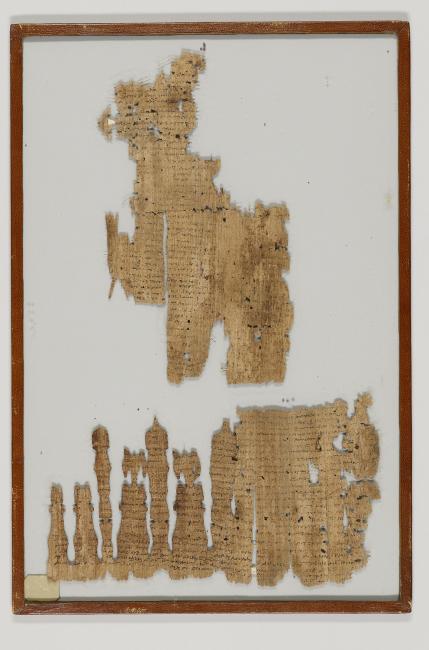 1 pane of glass containing 2 papyrus fragments ; 10 x 6 in.; 10.5 x 6 in.