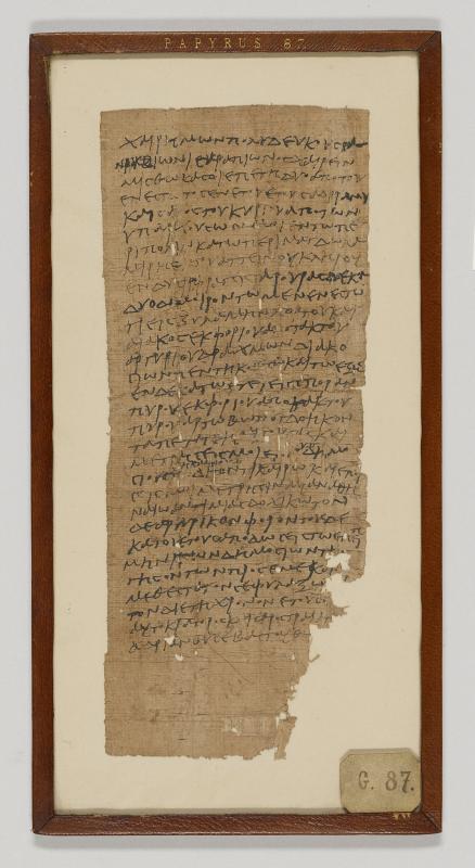 1 pane of glass containing 1 papyrus fragment ; 9 x 3.5 inches
