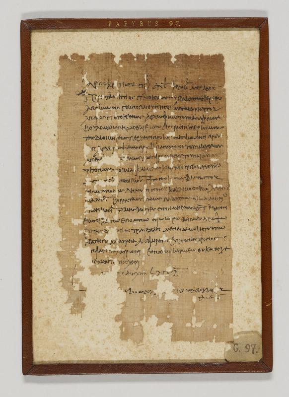 1 pane of glass containing 1 papyrus fragment ; 8.5 x 5 inches