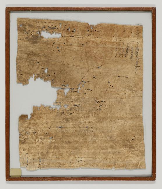 1 pane of glass containing 1 papyrus fragment ; 14.5 x 12 inches