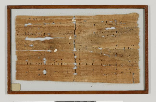 1 pane of glass containing 1 papyrus fragment ; 8 x 14 inches