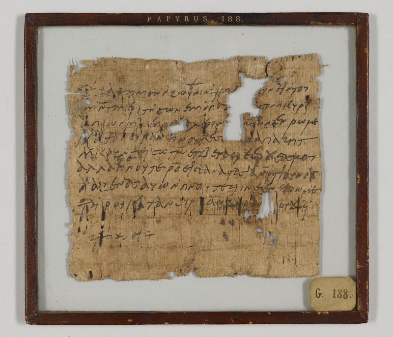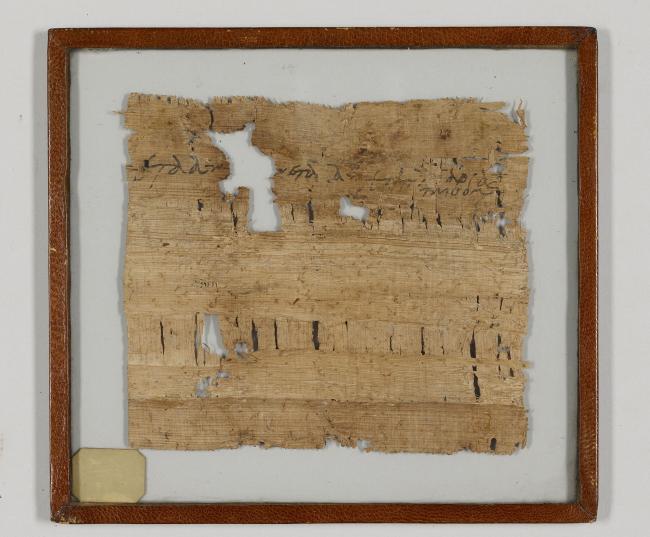 1 pane of glass containing 1 papyrus fragment ; 5 x 6 inches