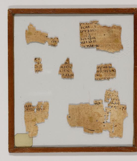 1 pane of glass containing 7 papyrus fragments ; 1 x 1.5 in.; 3 x 3.5 in.