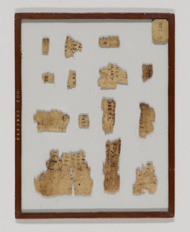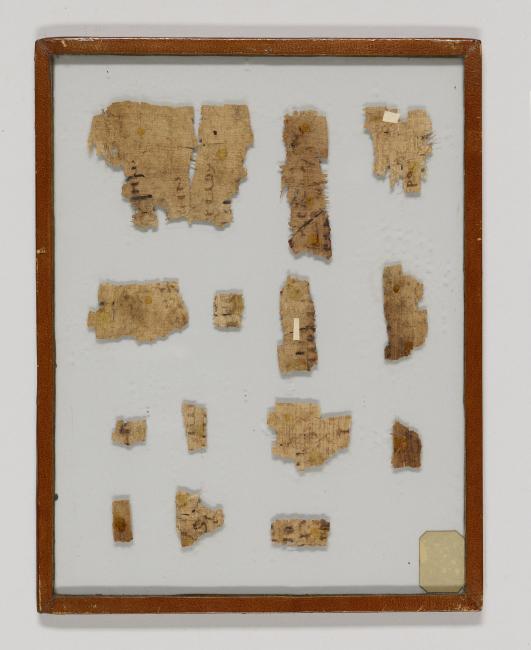 1 pane of glass containing 14 papyrus fragments ; .5 x .5 to 3 x 3.5 inches