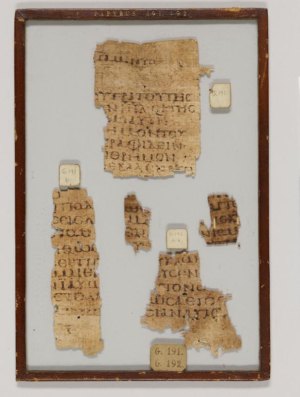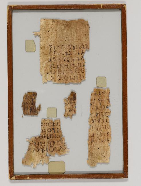 1 pane of glass containing 5 papyrus fragments ; 4 x 3.5 x 1 1/2 in.; 1 1/2 x 1 in.; 1 1/2 x 1 in.; 3 x 3 in.