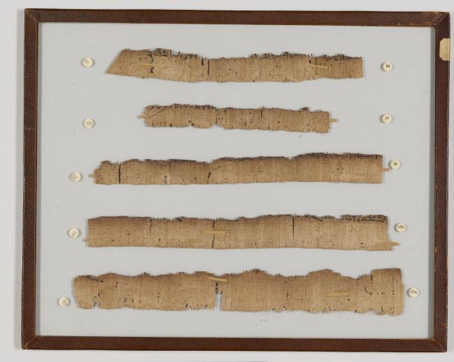 1 pane of glass containing 5 papyrus fragments ; 1 x 6 1/2 in.; 1 1/2 x 11 1/2 in.