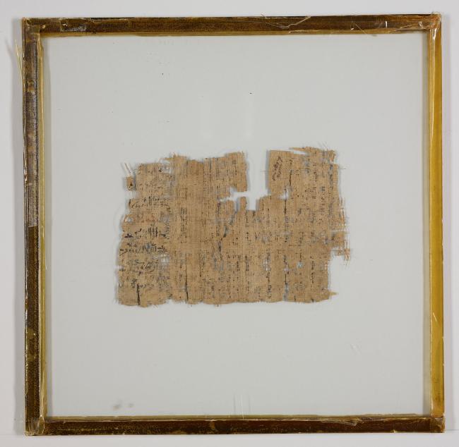 1 pane of glass containing papyrus fragment ; 6 x 4 1/2 inches.