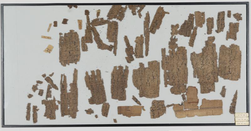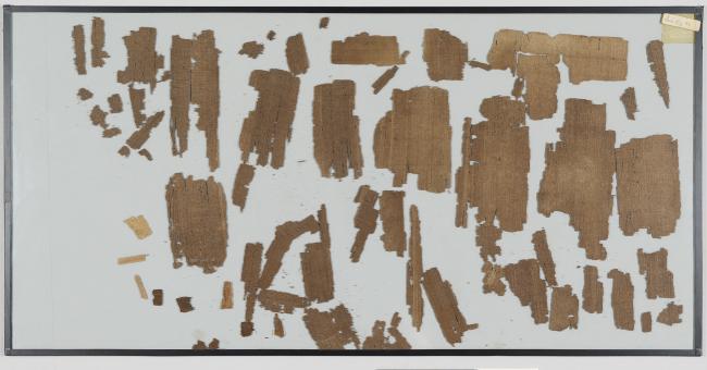 1 pane of glass containing 20+ papyrus fragments; 30 x 15 inches