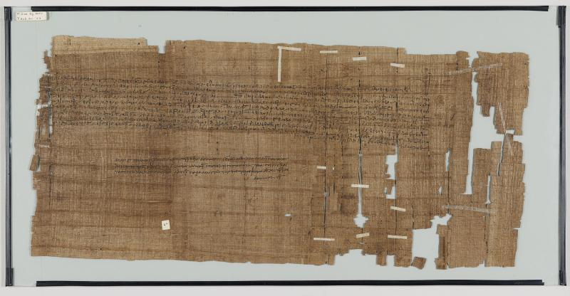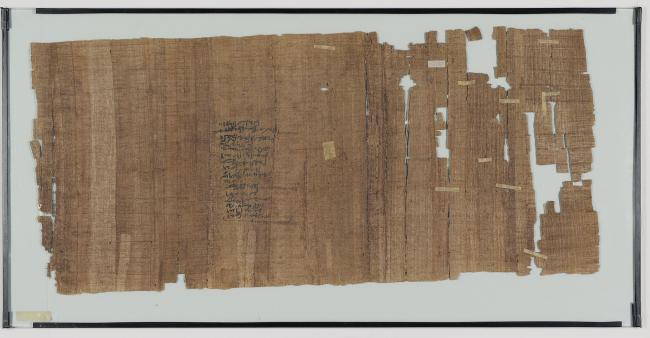 1 pane of glass containing 1 papyrus fragment ; 13 x 29 inches