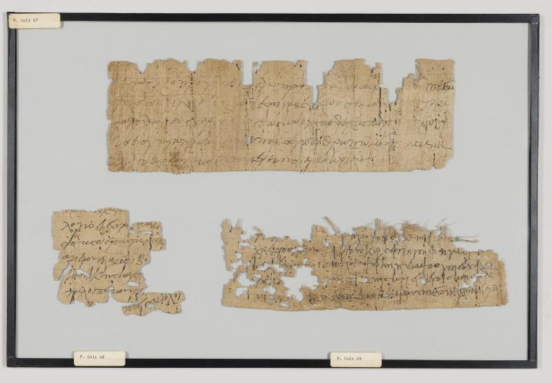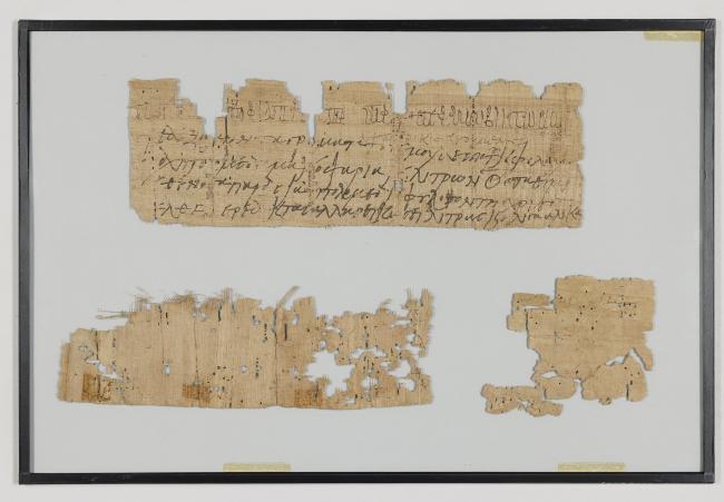 1 pane of glass containing 3 papyrus fragments ; 4 x 11.5 in.; 3.5 x 4.5 in.; 3 x 10 in.