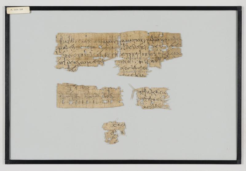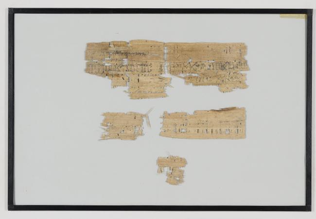 1 pane of glass containing 5 papyrus fragments ; 3 x 5 in.; 4 x 5 in.; 5 x 2 in.