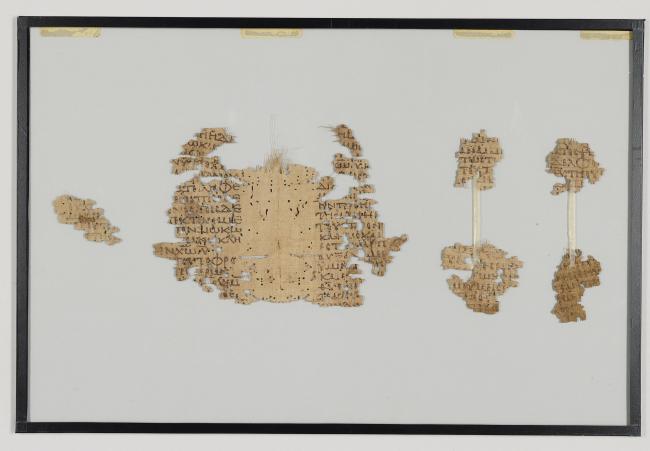 1 pane of glass containing 6 papyrus fragments ; 5 x 7 inches