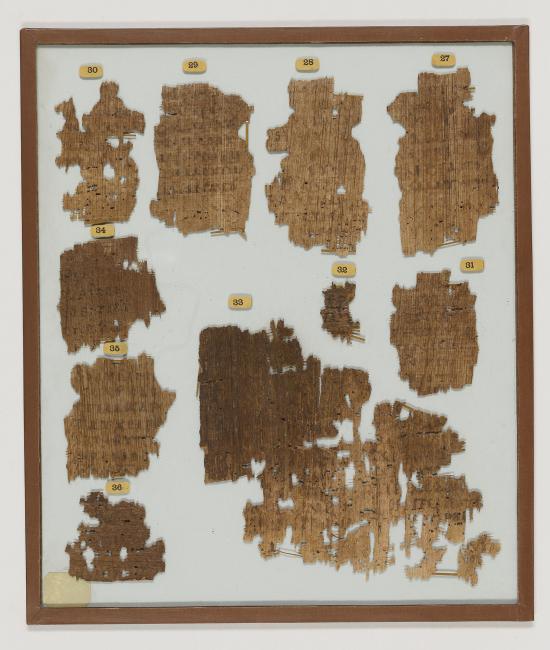 1 pane of glass containing 10 papyrus fragments ; 7 x 8 inches and smaller