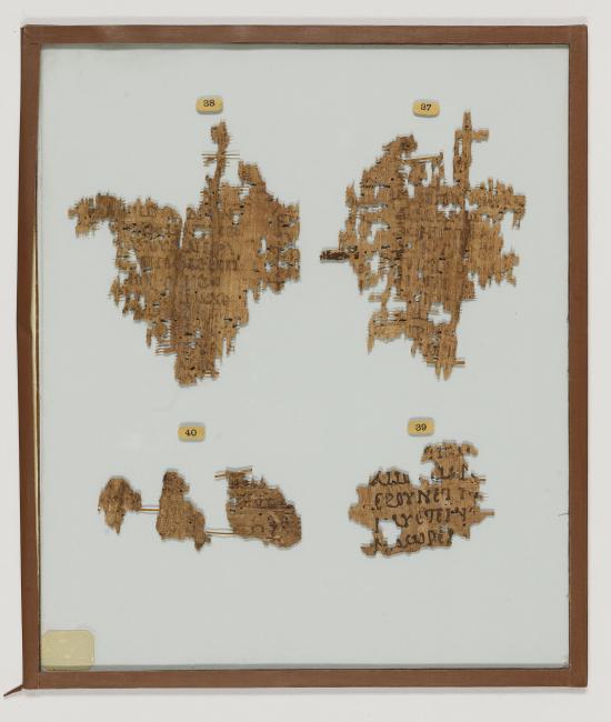 1 pane of glass containing 4 papyrus fragments ; 5 1/2 x 4 1/2 in.; 5 1/2 x 5 in.; 2 1/2 x 3 in.; 4 x 2 in.