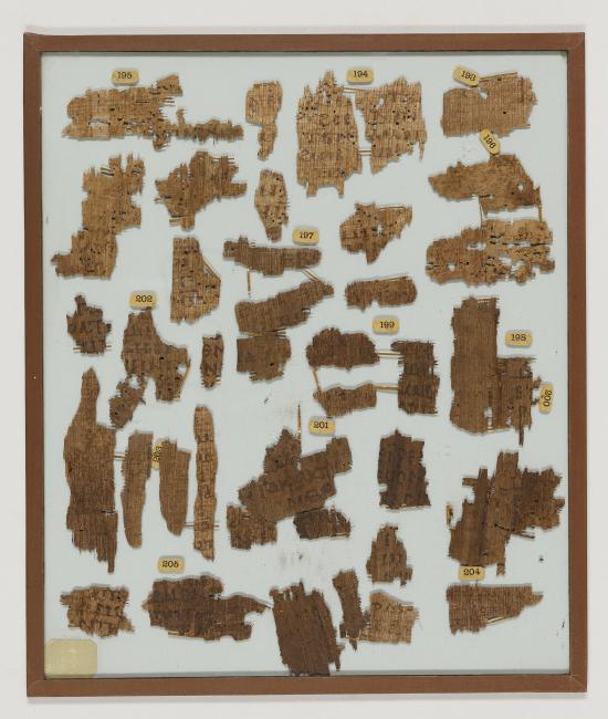 1 pane of glass containing 40 papyrus fragments ; 3 x 2 1/2 inches and smaller