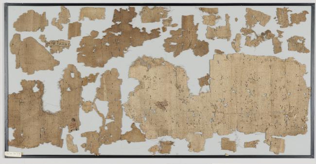 1 pane of glass containing 15 papyrus fragments ; 14 x 31 inches